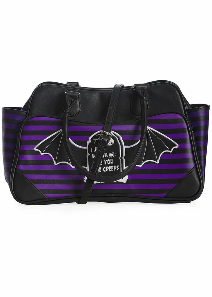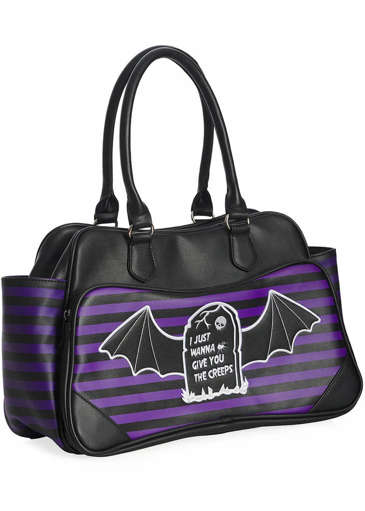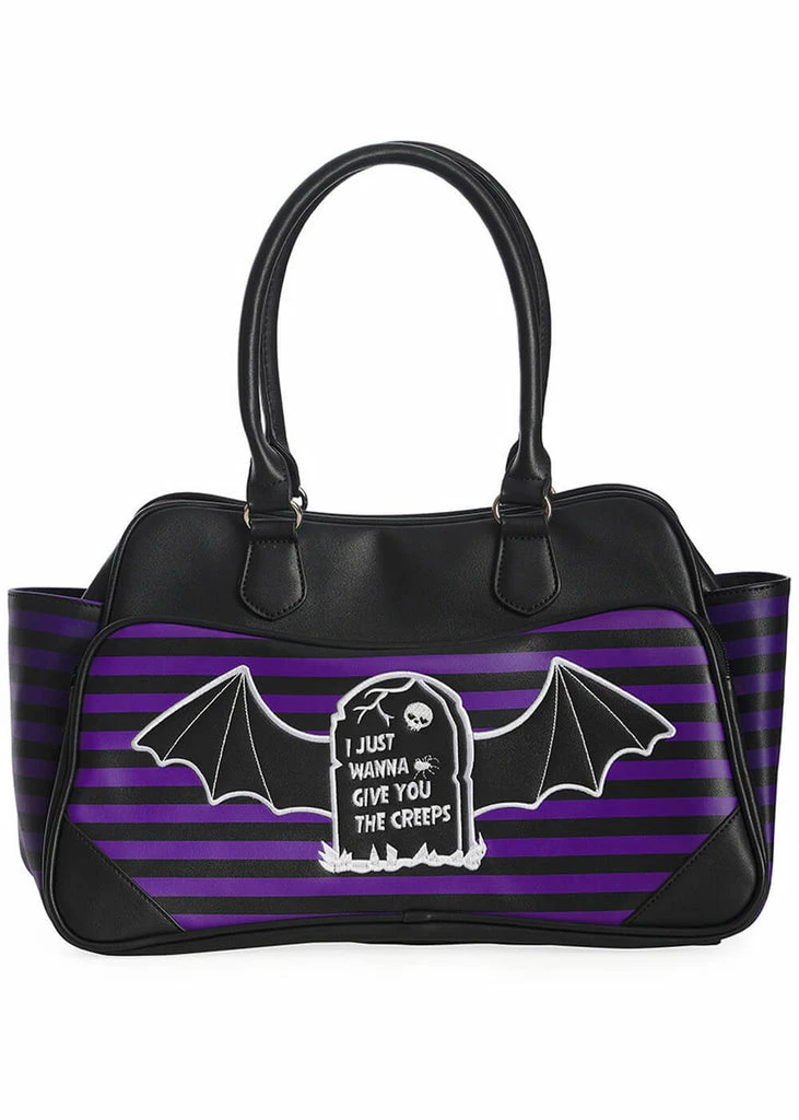 You’re definitely doing your best with this great bag: the wide front pocket that closes with a zipper is adorned with a ghoulish detail of a tombstone with embroidered edges, skull, spider and enormous wings…