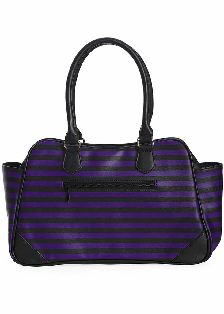 This beauty is made of a lovely quality striped faux-leather and with her size of 38 cm, she’s big enough for a tablet, phone and your essentials. She has three inside pockets (one of which closes with a zipper), the back has another zipper pocket. You can carry her in your hand, or sweep her over your shoulder with the detachable strap.