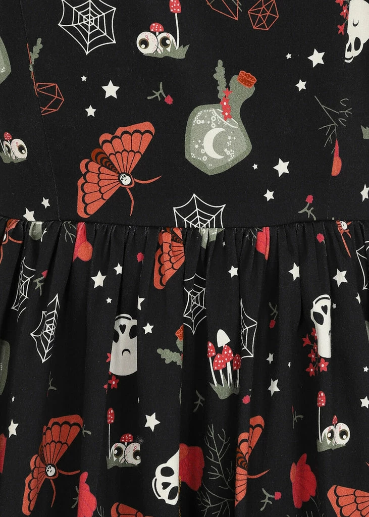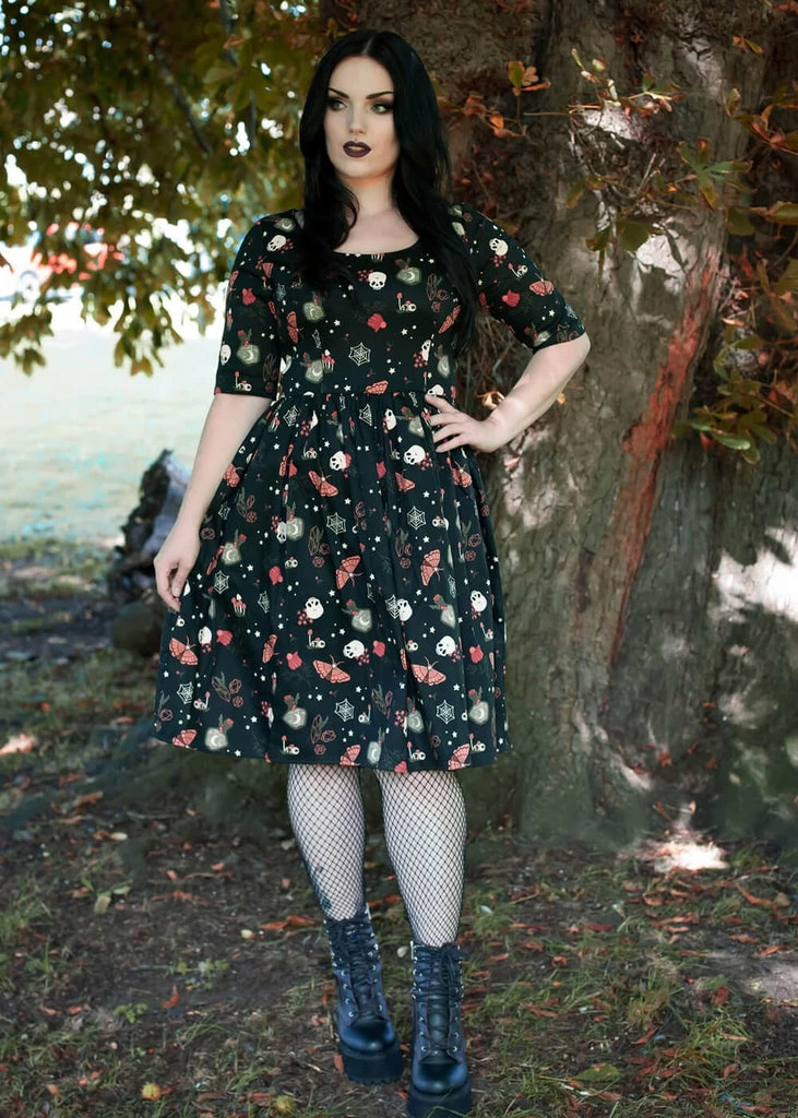 This beauty is made of a beautiful quality cotton-mix with a slight stretch and a satin finish, making those colours shimmer your way. The waist is accentuated with the seam, down from which she flares out into a full skirt through narrow pleats. She’s perfect for combining with one of our petticoats for that festive look! With a height of 1,70 she reaches down to the knee and closes with a zipper on the back.