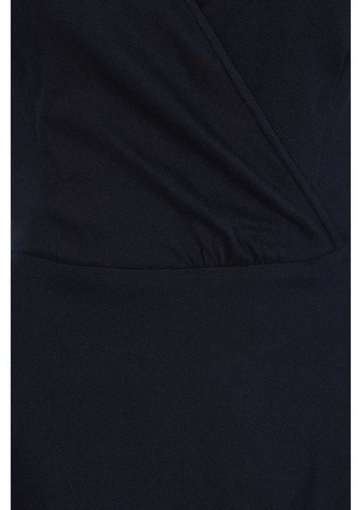 Her wrap on the chest gives her a charming fit, and as if we weren’t impressed enough, the neckline continues into 2 wide straps across the back. Made of a stretchy bengaline, you’ll always be comfortably dressed. The wrap on the chest continues towards the waist, down from which she flares out into a stunning swing skirt which with a heigth of 1,70 reaches just over the knee and is amazing when combined with one of our petticoats for that true pin-up effect. And have we mentioned yet that she has pockets? 😉