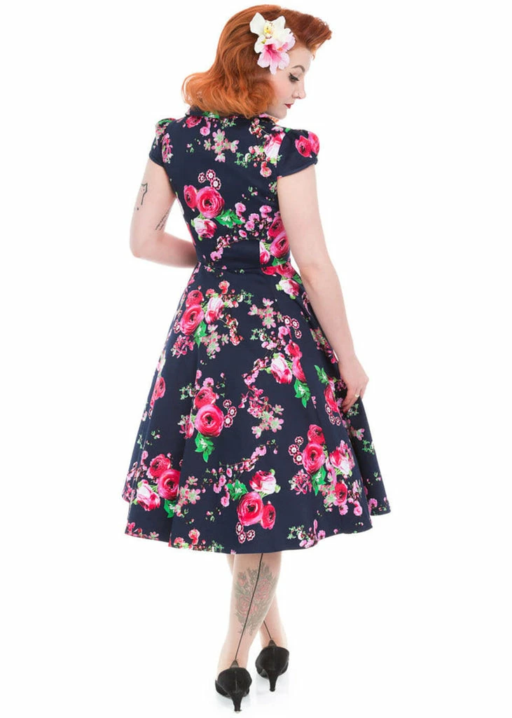 This beauty has a classic vintage look with her lovely navy cotton with a slight stretch which is lovely to wear. But those details! The pink flowers, the puffy cap sleeves or that playful tilted row of buttons on the front, she’s a lust to the eye!