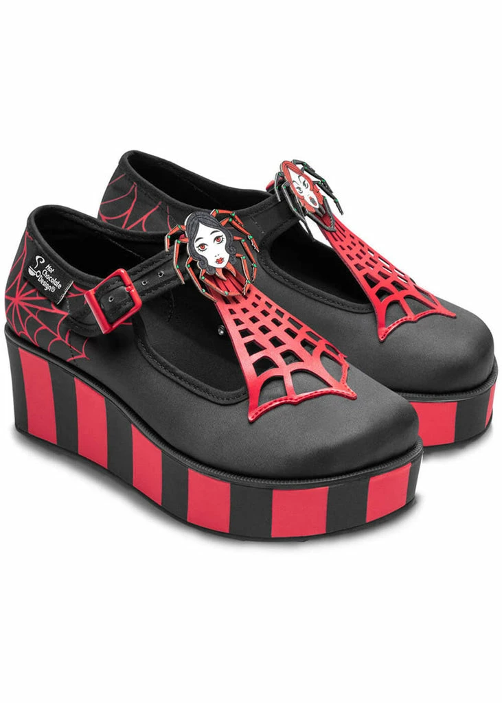 Get tangled in the web of Spindora, who spun it over your foot! The ladies themselves are sitting above their work, kept in place by removable clips over the adjustable t-strap. The textile coated vegan-leather has a joyful gloss and of course a spiderweb-print.