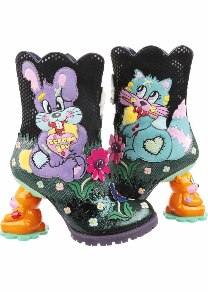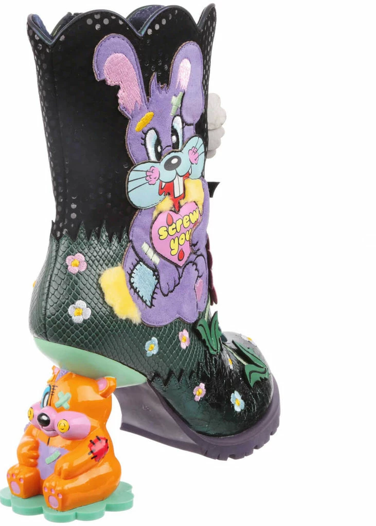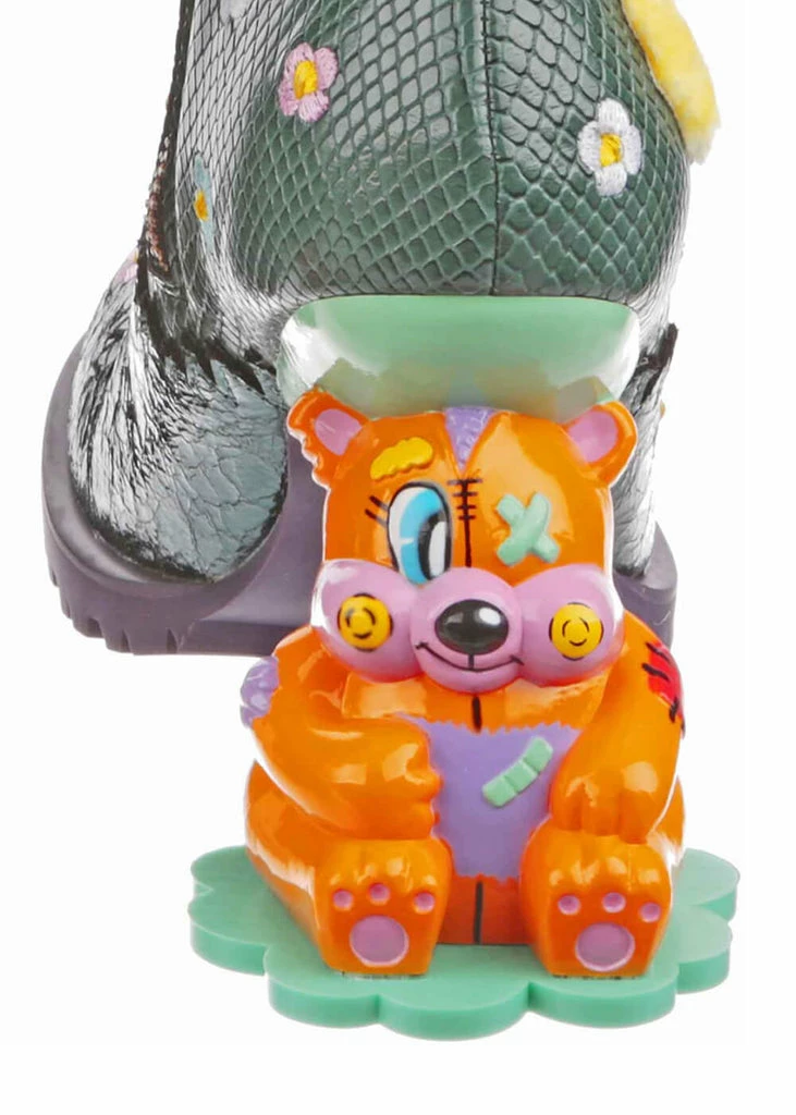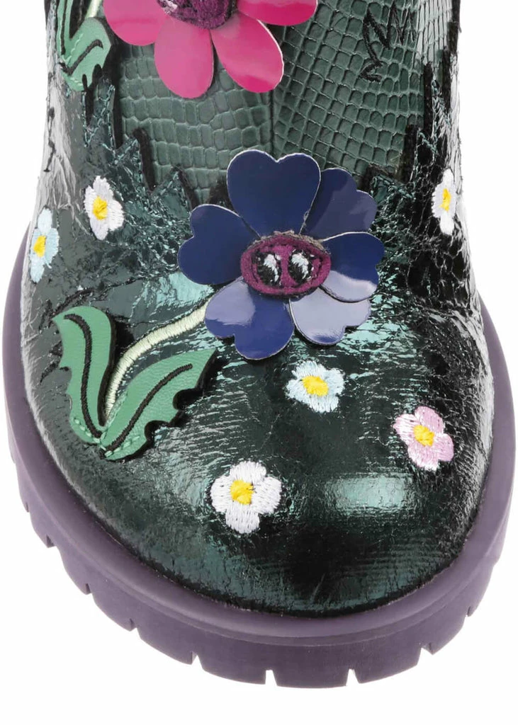 The boot is also a joy to the eye with the new, half decomposed friends on both sides, on a background of shiny metallic and faux-leather. The flowers are not only 3-D, they’ve also got their eyes on you, how bizarre! The boots close with a zipper on the inside.