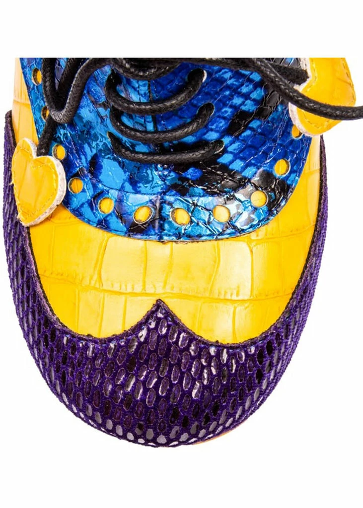 Clara Bow is a fun explosion, with her stunning faux-leather in so many bright colours and the exciting mix of textures! Her block heel of 5,5 cm is a joy to the eyes with its 60’s happy colour, and to the feet as well, thanks to the soft footbed. She closes with the lace, that is lovingly adorned with little hearts.