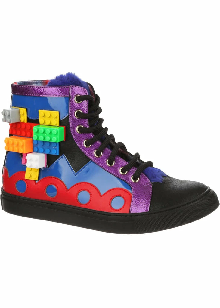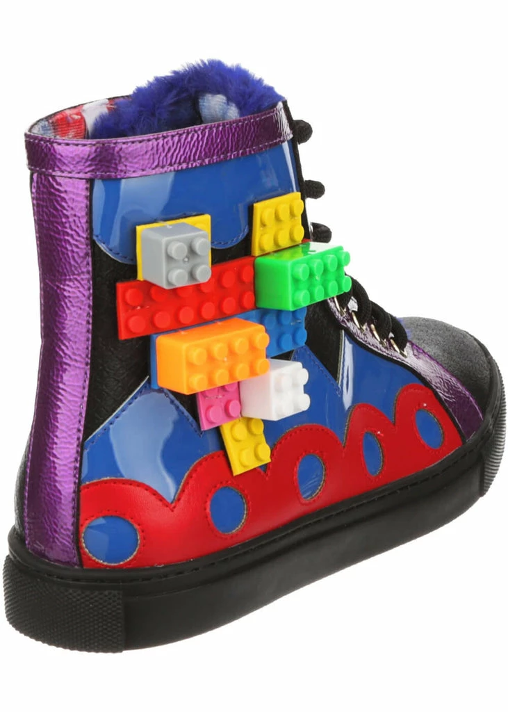 Even without a building project, the Colourful Kingdom sneakers are irresistible with their mix of patent and metallics, and a layer of fluff on the tongue! The inside is lined and they lace-up on the front.