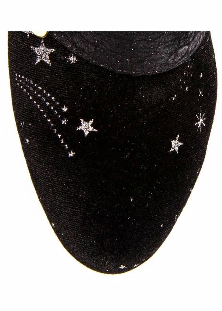 The embroidered starry sky sparkles on the super soft velvet, what a beauty… The block heel of 8 cm height is comfortably wide, so you can party all night long! The outside is crested with a long satin ruffle, while they close with a zipper on the inside.