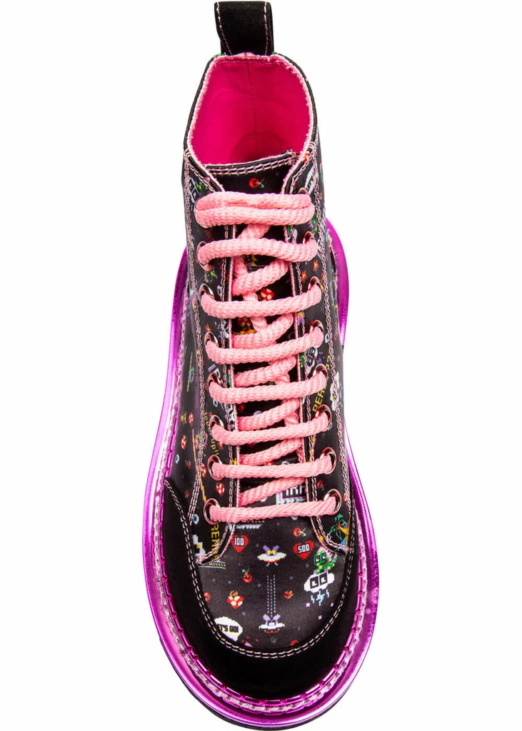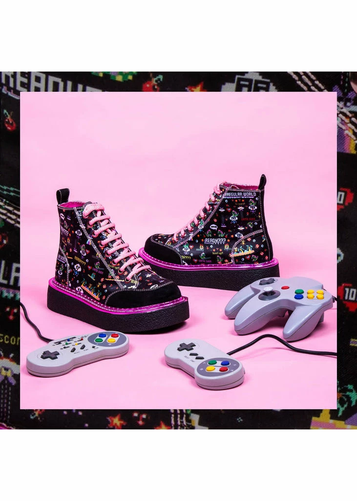 Are you ready for the Limit Break trainers? These incredible shoes are covered in what feels like satin and have a recognisable pattern with game-inspired figurines. The faux-suede edge along the front and the pink laces they close with make those colours pop even more. The thick 6 cm sole pokes out from the shoes and shimmers your way in a metallic pink layer!