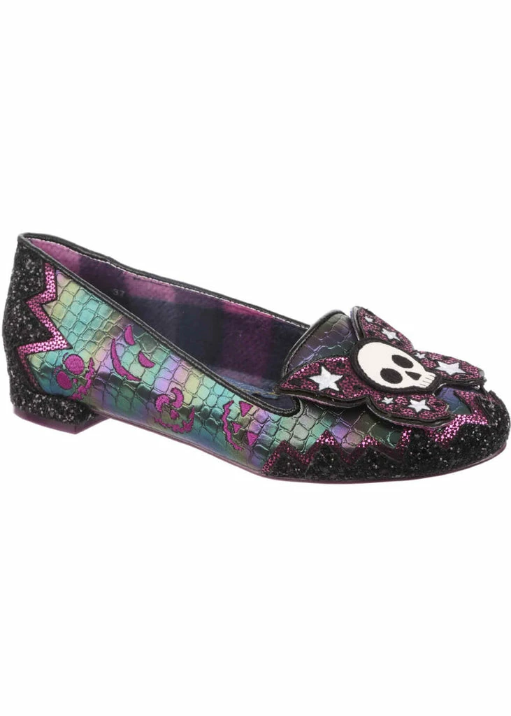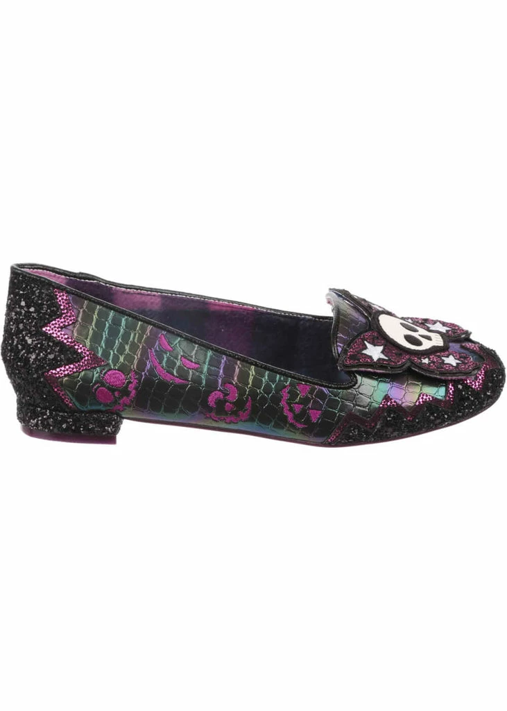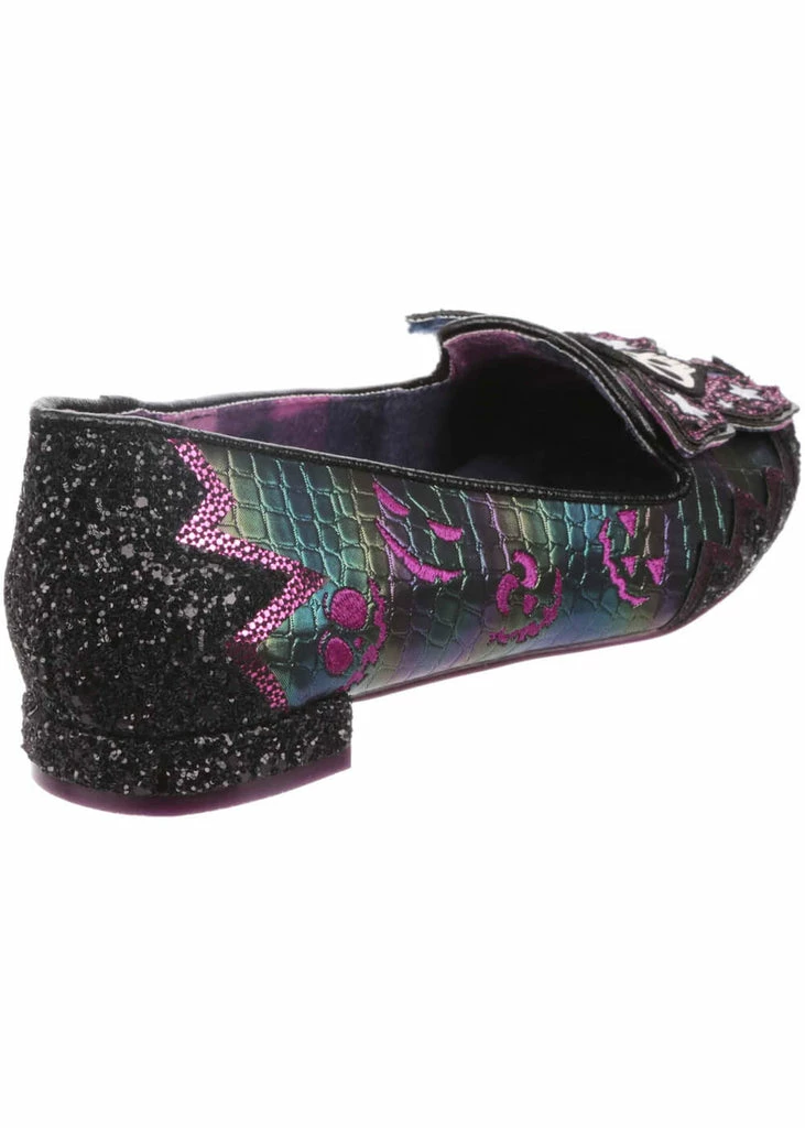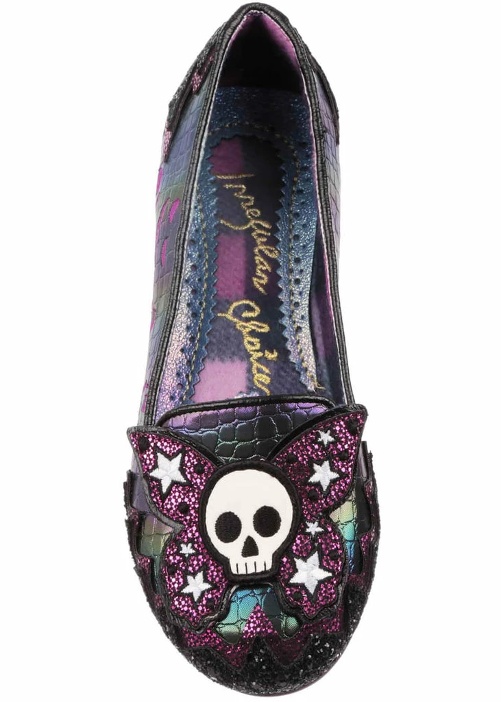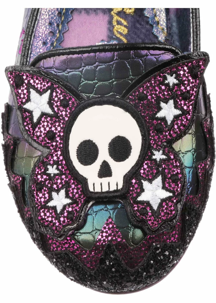 The skull on the rising front is extra FAB with the butterfly wings, adorned with pink glitters! Smile back at the embroidered smirks on the sides, on a background of faux-croc with an oily gloss, hypnotizingly beautiful… The glitters at the tip, the back and the 2 cm heel are making the Halloween party complete.
