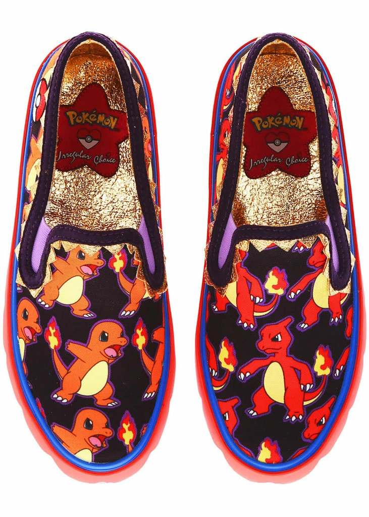 These brilliant shoes are covered in fire-Pokémon on a beautiful quality faux leather with textile. The blue soles are embellished with a red edges that appears to be dripping down.