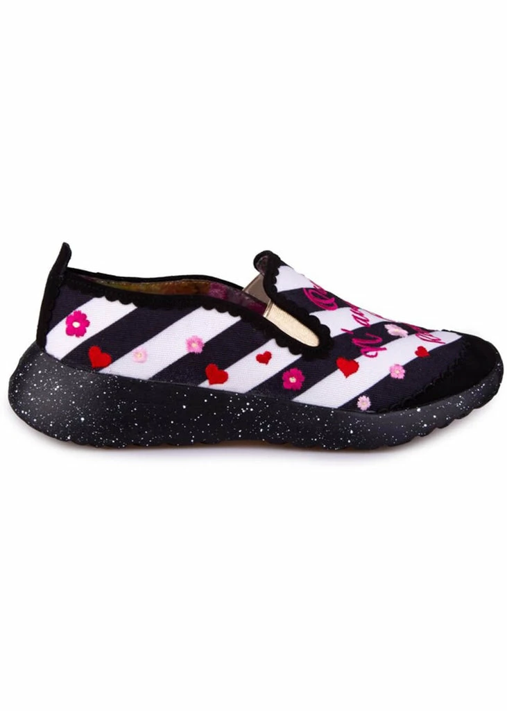 Of course with that special touch of Irregular Choice, with a fabric top with embroidered text and poodle. The soft footbed, elastic pieces next to the flap and the thick, inclining sole have you walking on clouds. A sporty look with a special twist! Mind you, sporty look and not sporty character, they’re no sport shoes 😉