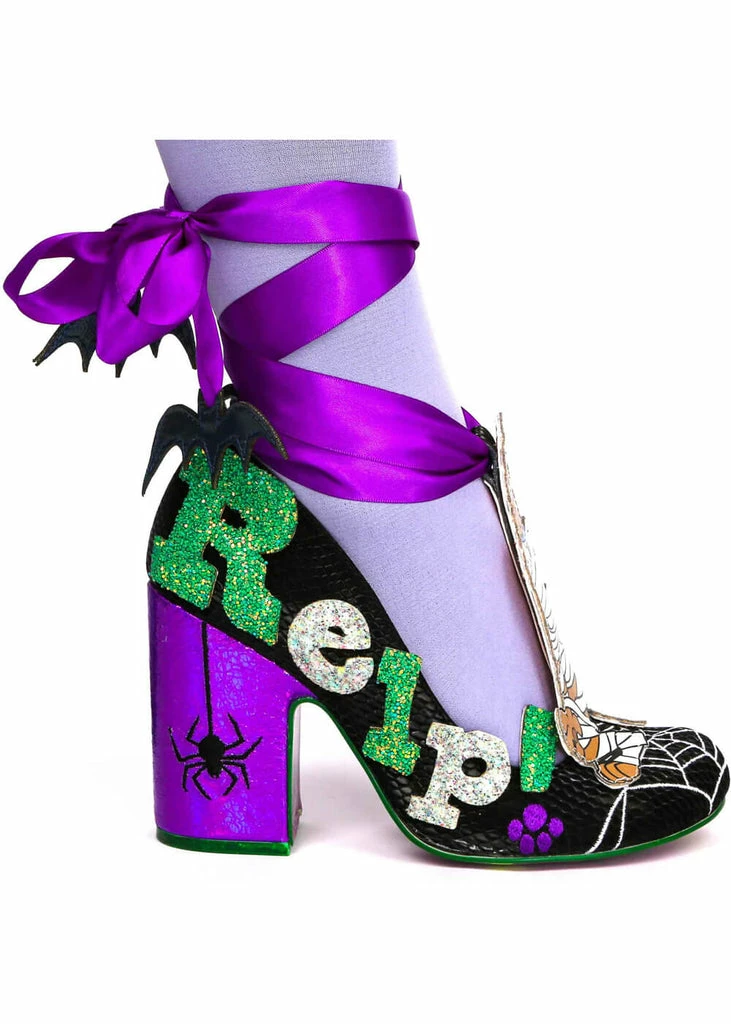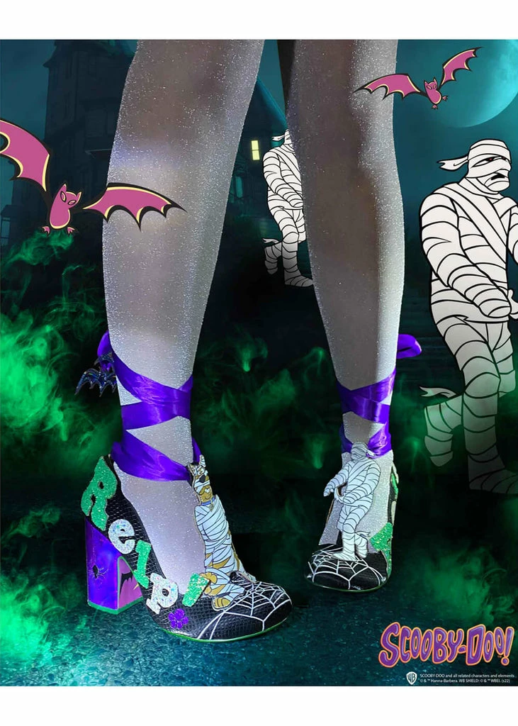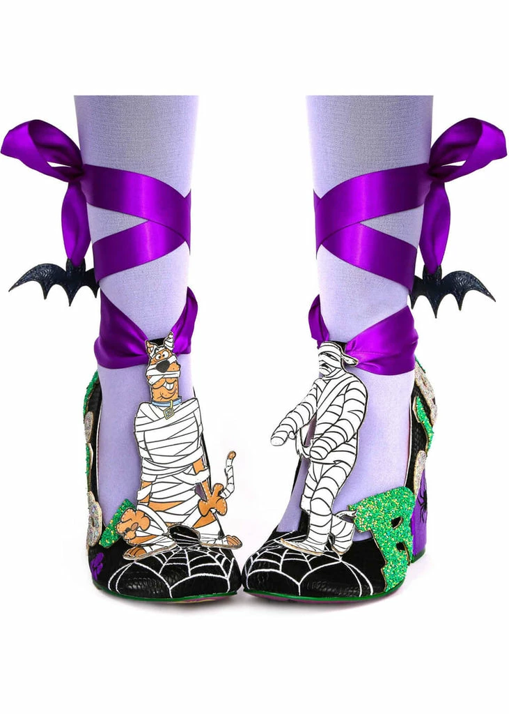 Scooby is not the only one who’s wrapped, your own leg will be wrapped in a beautiful satin ribbon, with bats! The faux-croc covered pump is adorned with ‘Relp!’, you can almost hear him shout 😉