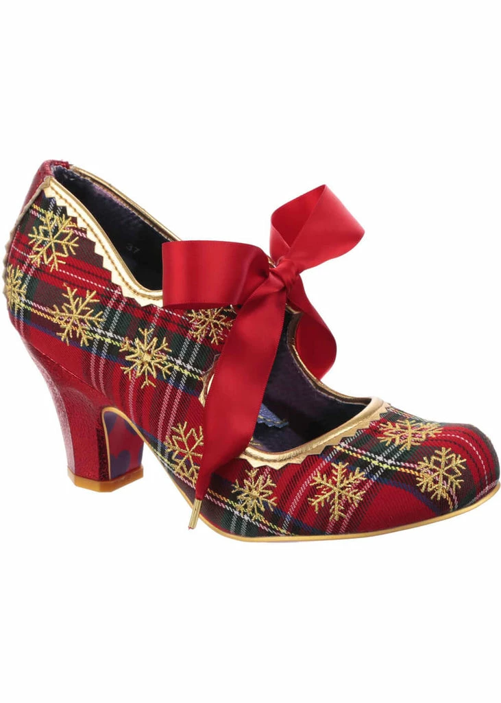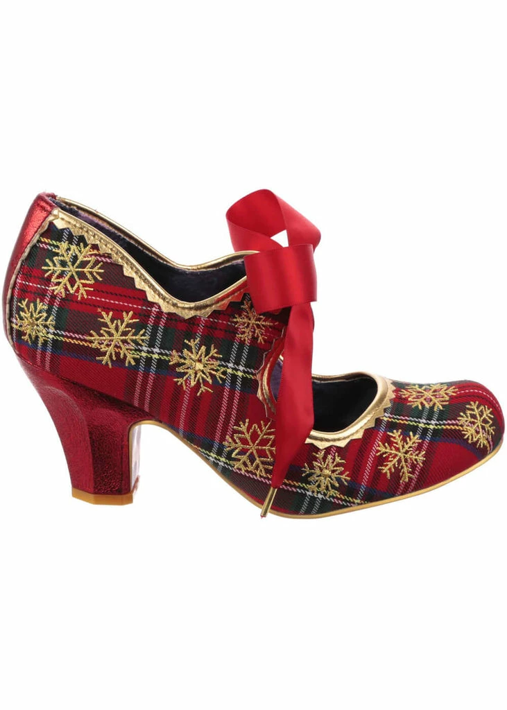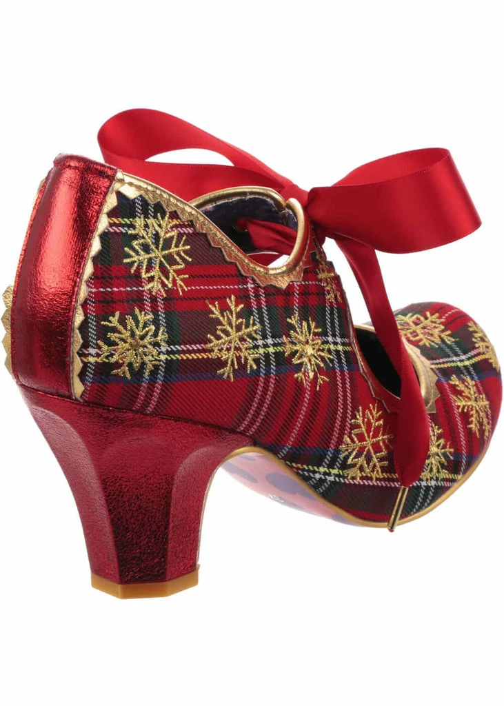 The red metallic heel of 7 cm is a bit wider and therefore nicely comfortable, even more so with the soft footbed that is covered with a layer of velvet. The sole bears a festive print you can preserve with the special Irregular Choice Sole Protectors.