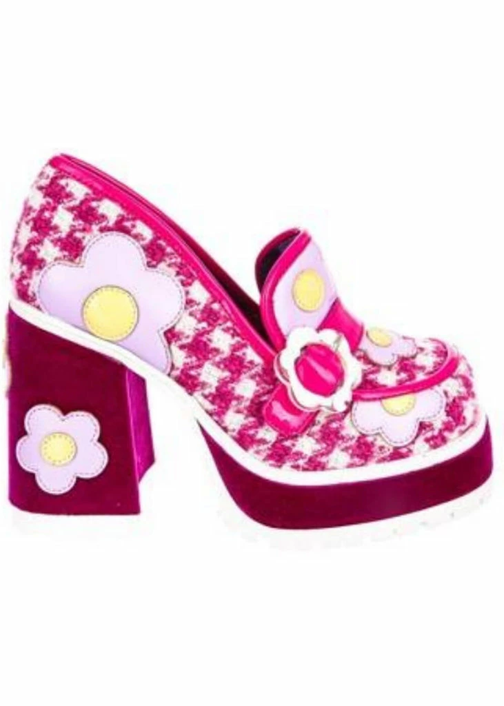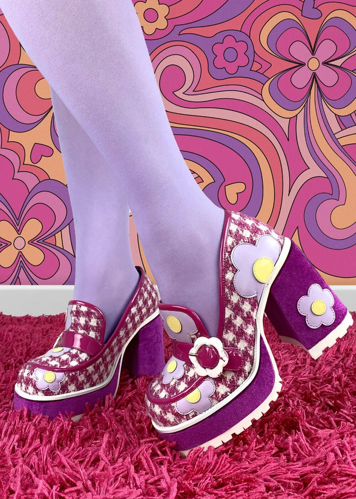 She is just an explosion of fun, with her textile houndstooth outerlayer, and so many faux-leather flowers and pvc-edges.