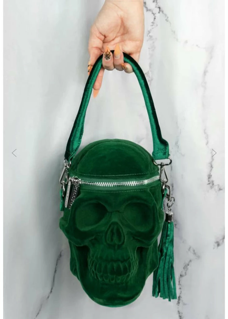Grave Digger Skull is an extraordinarily well made back in the shape of a skull, that is covered in a layer of green velvet (handle with care). She stunningly keeps her shape and opens on the top. The tassle on the side is detachable, and she’s easily swooped over the shoulder with an adjustable shoulderstrap.