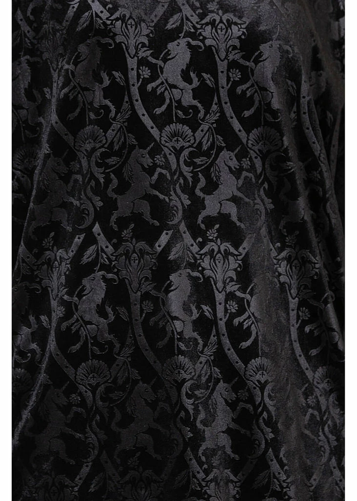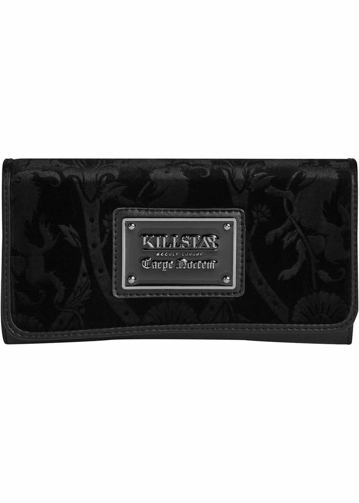 Her pitchblack velvet is adorned with these breathtaking mythical creatures, on a wallet of a strong, high quality vegan faux-leather, that keeps its shape nicely.