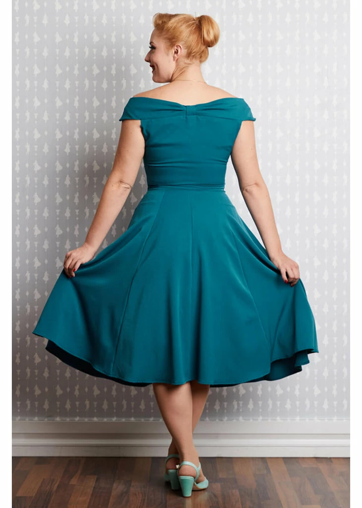 Her details are to die for… for example the off-shoulder collar, that is fastened in the middle, that also makes for a stunning back. The skirt has a surprise for you: pockets, adorned with little bows! This beauty is made of the famous high quality Miss Candyfloss fabric that has fine stretch and is lovely to wear.