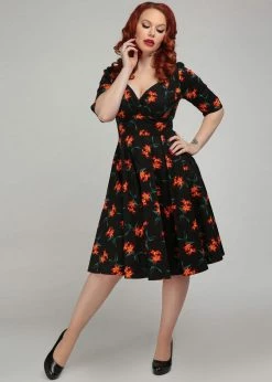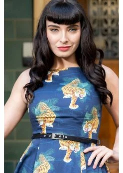Your slimmest part is accentuated by the waist seam, from where she flares into a full circle skirt with pockets that you can beautifully wear with one of our petticoats for the perfect 50’s look. She closes with a zipper and for a height of 1.70 m, she ends below the knees. Pretty Dress Company is made in the UK.