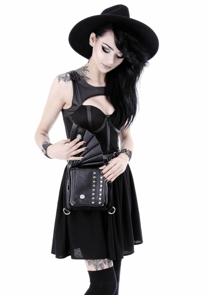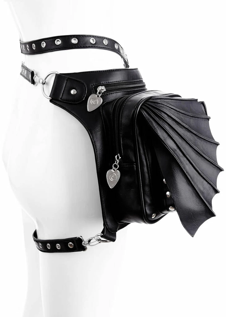 The bag has 3 detachable straps, so it stays securely attached to you. It’s made of a nice quality faux leather, so the wing stays out.