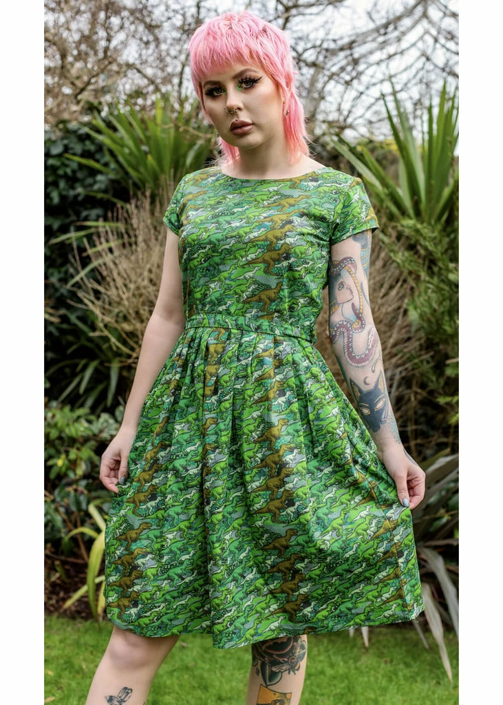 The figure seams in the bodice give her a lovely fit. The high waist is accentuated by the loose sash which can be tied on the back, then through flat pleats she flares out into a playful skirt. She closes with a zipper on the side and with a height of 1.70 she just about sits on the knee.