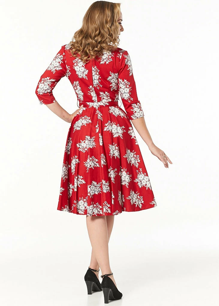 With her light flower pattern on the warm red background and 3/4 sleeves, she is everything we wish for this autumn and winter. She has an overlap on the chest and small gatherings above the waistband for a classic 50’s look. this beauty is made of a fine cotton-mix with slight stretch and is so great to wear that she’ll never be in the closet for long 😉