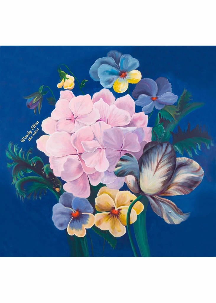 Get carried away by this calming picture of flowers, on a blue background…. The art is displayed on either side and is printed on a waterresistant-microfiber, perfect for the environment 😉 The side and botton are finished with a high quality vegan-leather.